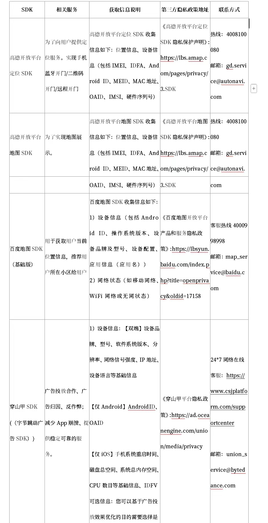 為了提供更完善的功能,我們APP使用了以下第三方SDK,以下為您詳細(xì)列出上述服務(wù)中涉及到第三方SDK獲取信息的詳情,為便于您更好地理解第三方SDK個(gè)人信息收集使用規(guī)則,您可以登錄或訪問(wèn)為您提供的第三方隱私政策或接入平臺(tái)相關(guān)服務(wù)協(xié)議鏈接了解其《隱私政策》和服務(wù)對(duì)接細(xì)則。